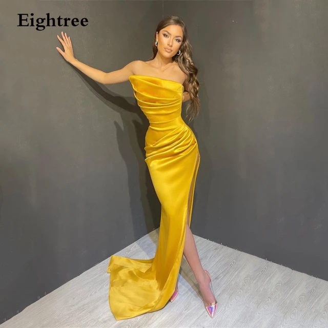 2022 Modern Gold Satin Sleeveless Prom Dress High Side Slit Strapless Floor Length Evening Gowns Formal Party Dresses Vestidos Prom Dresses Aliexpress